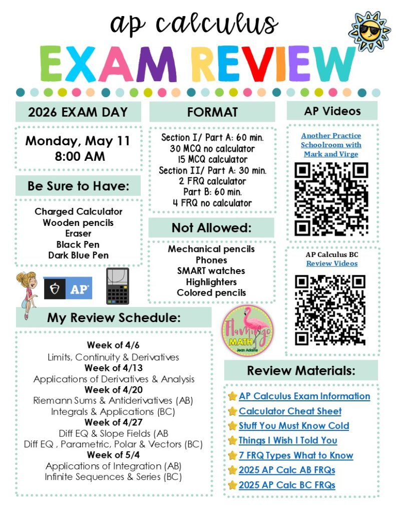 It’s that time of year again! As the calendar turns toward spring, the focus in our classrooms shifts toward one of the most rewarding parts of the year: AP Exam Prep. With the AP Calculus AB and BC Exams scheduled for Monday, May 11, 2026, we have a clear window to help our students synthesize everything they’ve learned from Limits to Lagrange. To support you during this intensive season, Flamingo Math has updated our favorite resources to ensure your students feel confident and prepared.