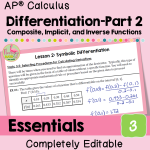 ⭐⭐ This AP Calculus Unit 3 Essentials Bundle provides you with a customizable and fully-editable resource of Guided Notes, Video Lessons, Google Slides, practice/homework sets, and a daily content quiz that cover the topics for Differentiation-Part 2 Composite, Implicit, and Inverse Functions. ⭐⭐