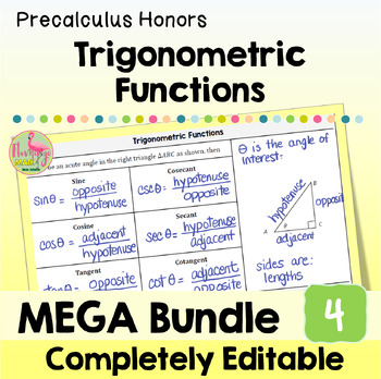 ⭐⭐ This Precalculus Unit 4 MEGA Bundle provides you with a customizable and fully-editable resource for the eleven lessons in the unit, aligned to meet your teaching objectives and standards for Trigonometric Functions. Guided Notes, Video Lessons, Google Slides, SMART Board slides, practice and homework sets, daily content quizzes, warm up exercises, review assignments, assessments, and cooperative activities. ⭐⭐